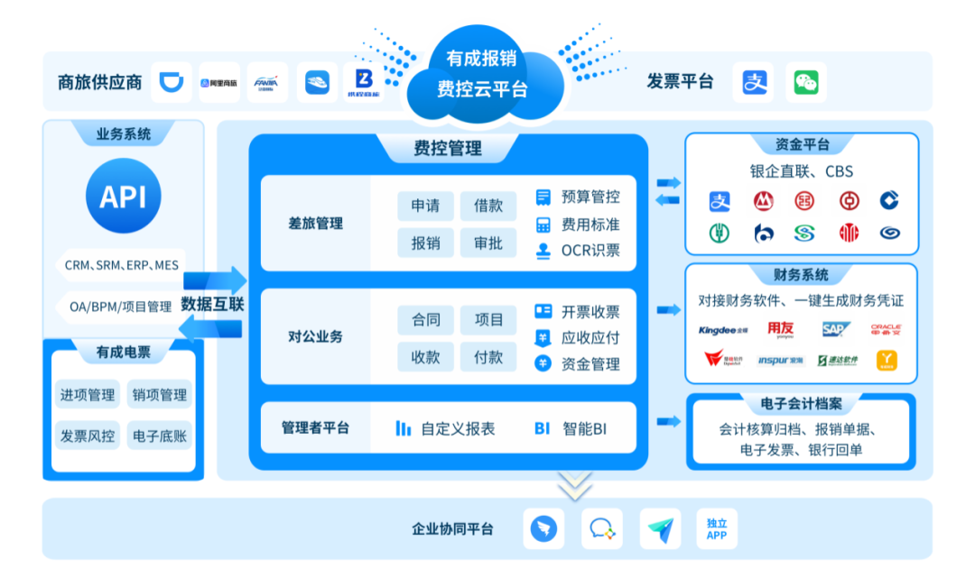 有成报销的「免报销」解决方案,依托互联网聚合滴滴、携程、阿里商旅等因公消费平台,对接1400多家银行及支付宝、微信第三方支付平台,费用单据直接驱动对公,对私付款,银行回单和单据实时关联,资金可追溯,对账更轻松;同时支持对接用友、金蝶、SAP等主流财务软件,还能实现与企业自身ERP、OA、CRM等业务系统无缝连接,尤其与有成系列产品(有成CRM、进销存、有成财务)深度融合的自身连接能力,帮助企业打通信息孤岛,实现智能业财一体化目标。