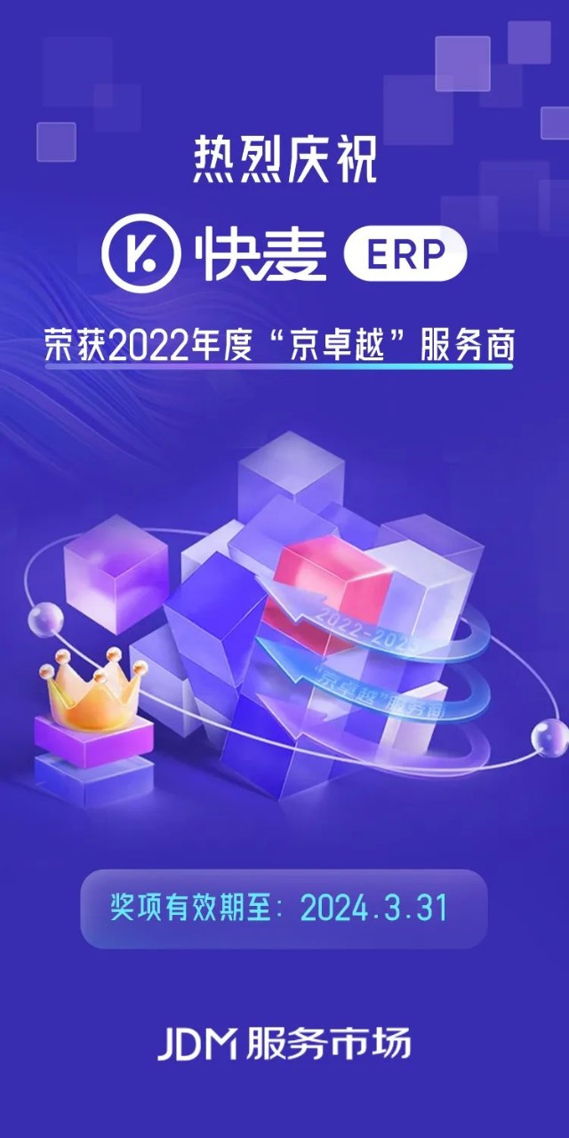 近日,2022年度京东服务市场“京卓越”服务商获奖名单正式公布,光云科技旗下快麦ERP再次凭借优质的服务,荣获软件类服务商订单工具“京卓越”合作伙伴奖项。