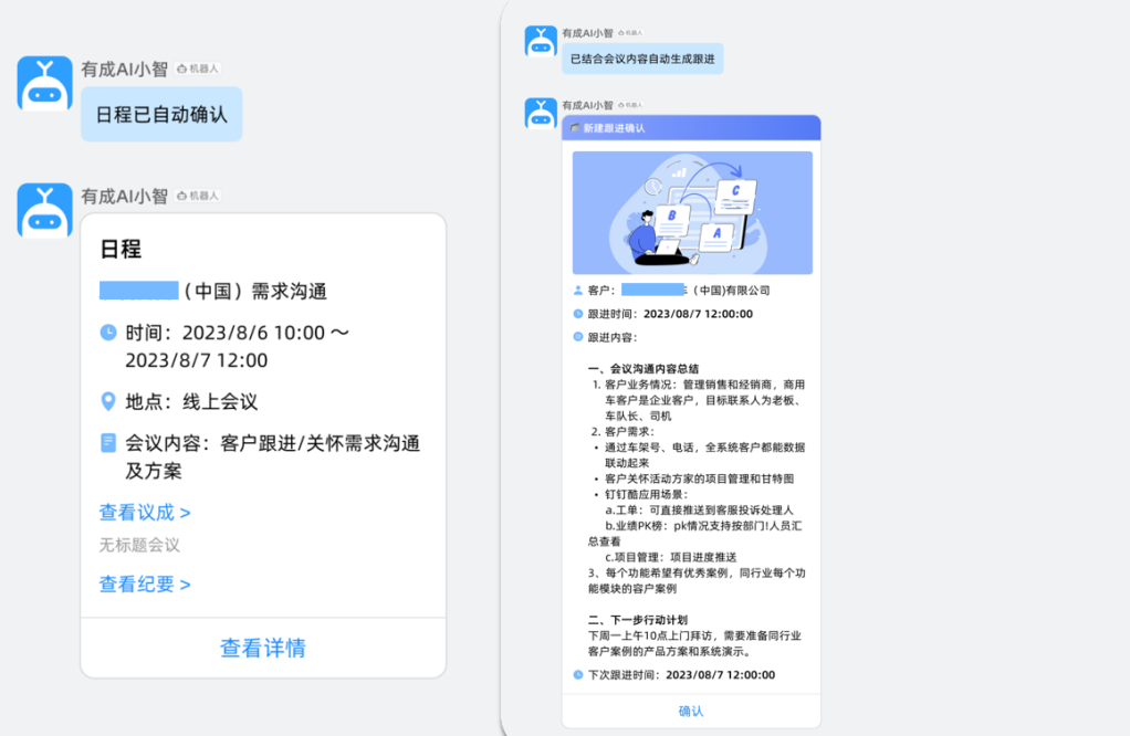 当销售初步了解客户后,就需要第一时间完成客户的录入报备,快速争取到在线或上门沟通的机会。这时有成CRM“销售专员”数字员工就秒变私人秘书,它会帮助销售自动完成客户信息的录入和报备,告别手工作业;还能根据双方的闲忙时间自动匹配合理日程安排推送到聊天窗口进行双方确认,提醒销售做好会议前的准备。在线上会议中,销售不需要再记录会议纪要,只需要呼叫有成AI小智,它会自动根据会议内容分析总结并完成跟进记录,取代销售原有“搬砖”性质的工作。